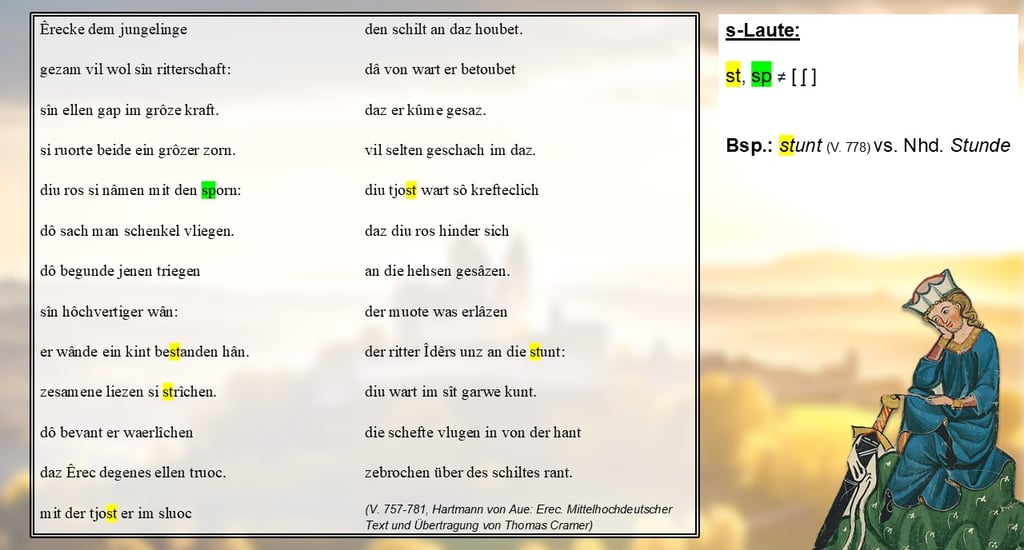 Was ebenfalls verwirren kann, sind die s-Laute: Hier musst du beachten, dass Kombinationen wie „st“ oder „sp“ nicht wie im Neuhochdeutschen mit einem sch-Laut realisiert werden, sondern eben wortwörtlich mit „s“. Ein Beispiel dafür findet sich in Vers 778 mit dem Substantiv „stunt“, das wir heute als „Stunde“ aussprechen. Die gleiche Regel gilt übrigens auch für die Buchstabenkombinationen „sl“, „sm“, „sn“ und „sw“.