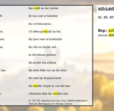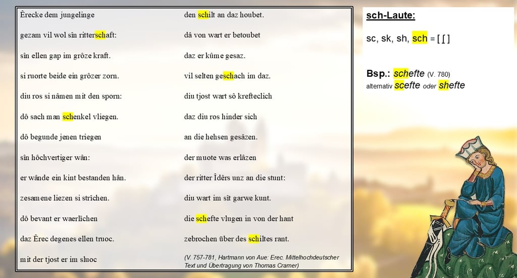 Natürlich gibt es aber auch im Mittelhochdeutschen sch-Laute, diese werden dann als „sk“, „sc“, „sh“ oder eben „sch“ wiedergegeben. In meiner Textfassung des „Erec“ findet sich nur die Variante mit „sch“, zum Beispiel bei „schefte“ (V. 780), in anderen Fassungen könnte hier aber auch durchaus „scefte“ oder „shefte“ stehen.