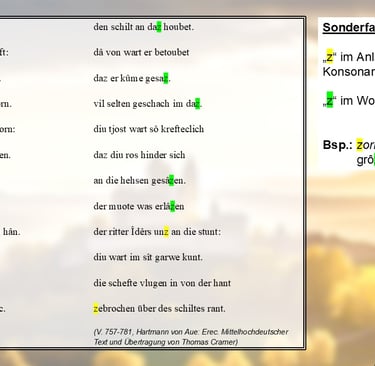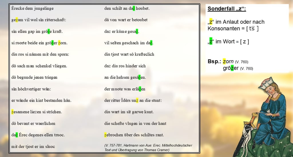 Auch der Buchstabe „z“ hat einen kleinen Stolperstein parat: Er kann sowohl – wie auch heute noch – für ein affrikates „ts“ stehen, wie beispielsweise in „zorn“ (V. 760) oder aber ein stimmhaftes [z] wiedergeben, wie in „grôzer“ (V. 760). Ersteres gilt für das „z“ im Anlaut, Letzteres findet sich innerhalb einer Silbe oder am Wortende.
