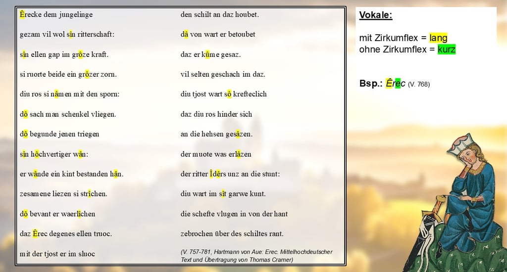 Zuerst einmal wären da die Vokale: Sofern diese kein Zirkumflex tragen – damit ist dieses kleine Dach hier gemeint – werden alle Vokale kurz ausgesprochen. Das kannst du zum Beispiel im Namen unseres Ritters „Êrec“ (V. 768) beobachten. Hier wird ein „E“ lang und ein „e“ kurz betont.