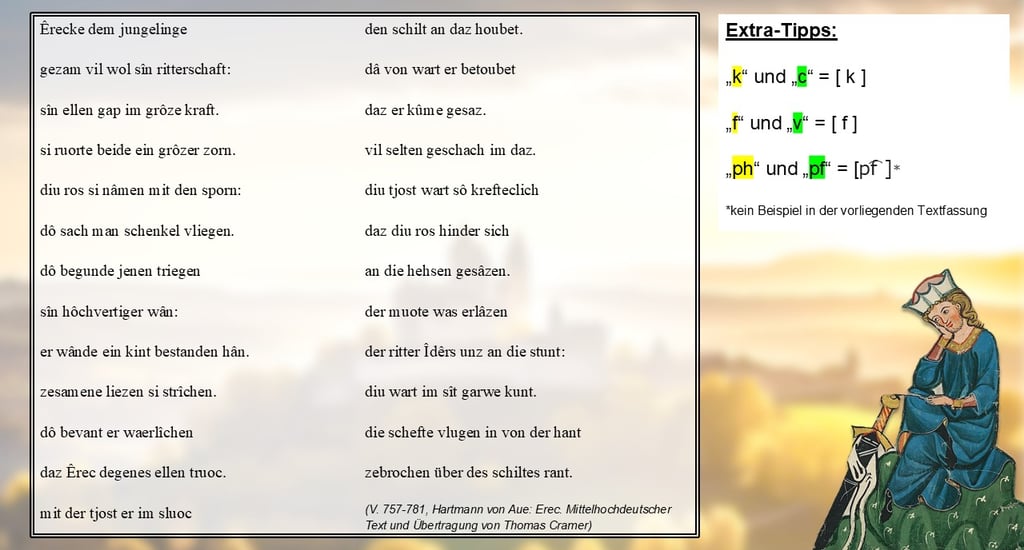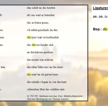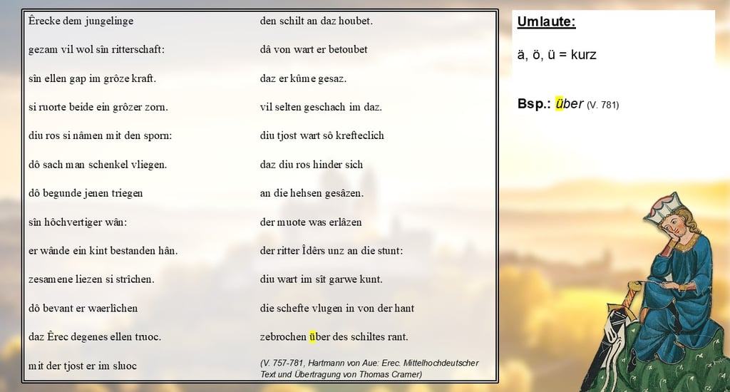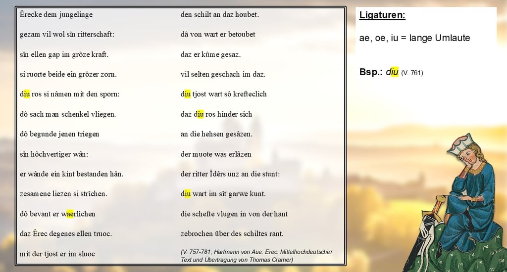 Dafür gibt es, anders als im heutigen Neuhochdeutschen, zusätzlich sogenannte Ligaturen, nämlich „ae, oe und iu“ – Vorsicht, die Kombination aus „i“ und „u“ spricht man nicht „iu“, sondern „ü“! Diese Ligaturen sind regelmäßig lang betonte Umlaute, wie zum Beispiel in „diu“ in Vers 761.