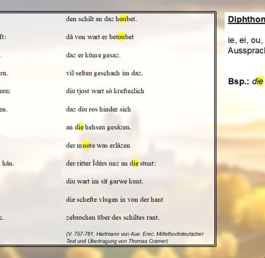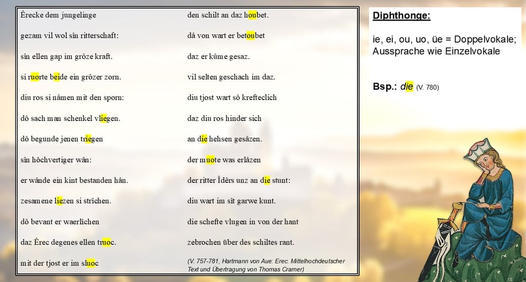 Diphthonge wiederum, also Doppelvokale, werden im Mittelhochdeutschen noch wie zwei einzelne Vokale ausgesprochen. Das „ie“ in „die“ (V. 780) zum Beispiel wird nicht wie heute als langes „i“ ausgesprochen, sondern eben als „i“ und „e“. Ähnlich funktioniert das bei den Diphthongen „ei“, „ou“, „uo“ und „üe“.