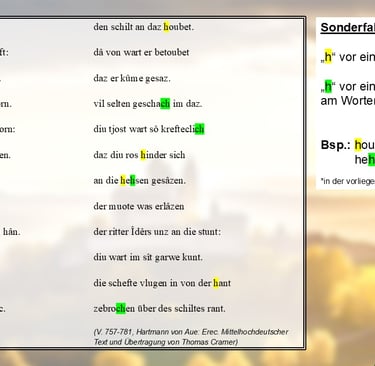 Weil es leichter ist, anhand von Textbeispielen zu lernen, habe ich dir hier mal einen kurzen Ausschnitt aus Hartmann von Aues höfischem Roman "Erec" (1180/90) abgetippt:
